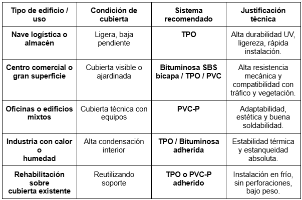 Sin embargo, la elección del tipo de impermeabilización no debe basarse únicamente en la costumbre o el precio, sino en una evaluación técnica precisa del uso previsto, las condiciones ambientales, las necesidades de mantenimiento y las exigencias térmicas o acústicas del edificio.