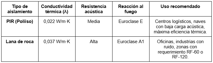 - Lana de roca: λ ≈ 0,037 W/m·K → mayor espesor, pero excelente comportamiento acústico y al fuego (Euroclase A1).